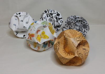 For some of her smaller pieces she prints patterns onto cardstock on her computer or uses colorful pages from magazines. Her work demonstrates a unique resourcefulness as well as patience and precision as she transforms pieces of paper into three dimensional items.