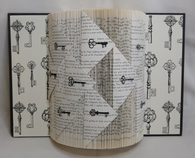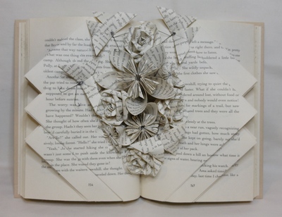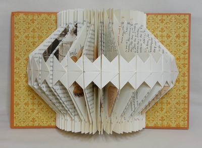 Judi applies folding techniques associated with origami. She uses sturdy books with good bindings and careful not to use anything antique or valuable. They are generally books that have become outdated, and have fallen out of use.